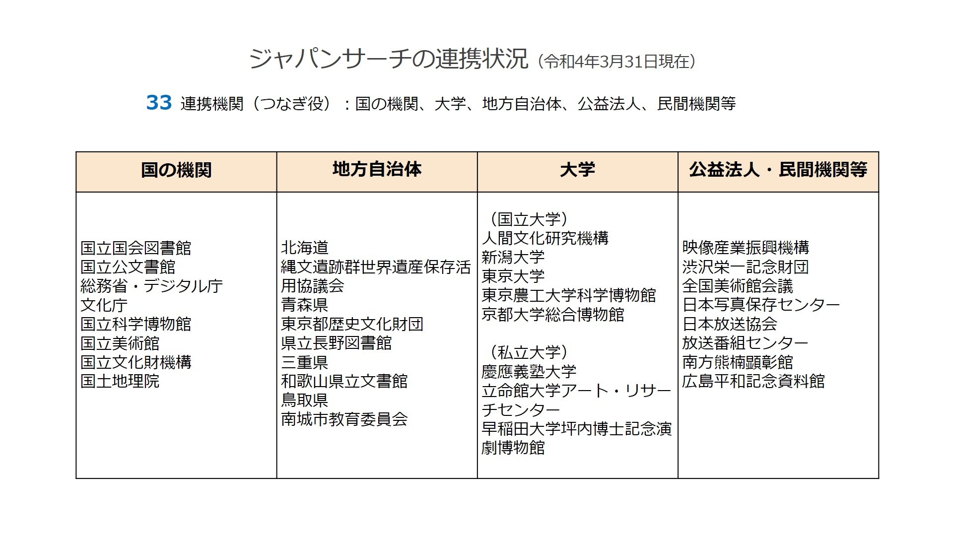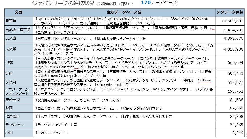 2022年3月末現在、33連携(つなぎ役)機関、170データベース(メタデータ約2,530万件)と連携しています(下表参照)。今後も更なる連携拡大を目指します。