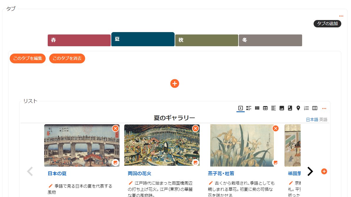 タブパーツを使えば、切り替え機能を使ってコンパクトに電子展覧会を作成できます。