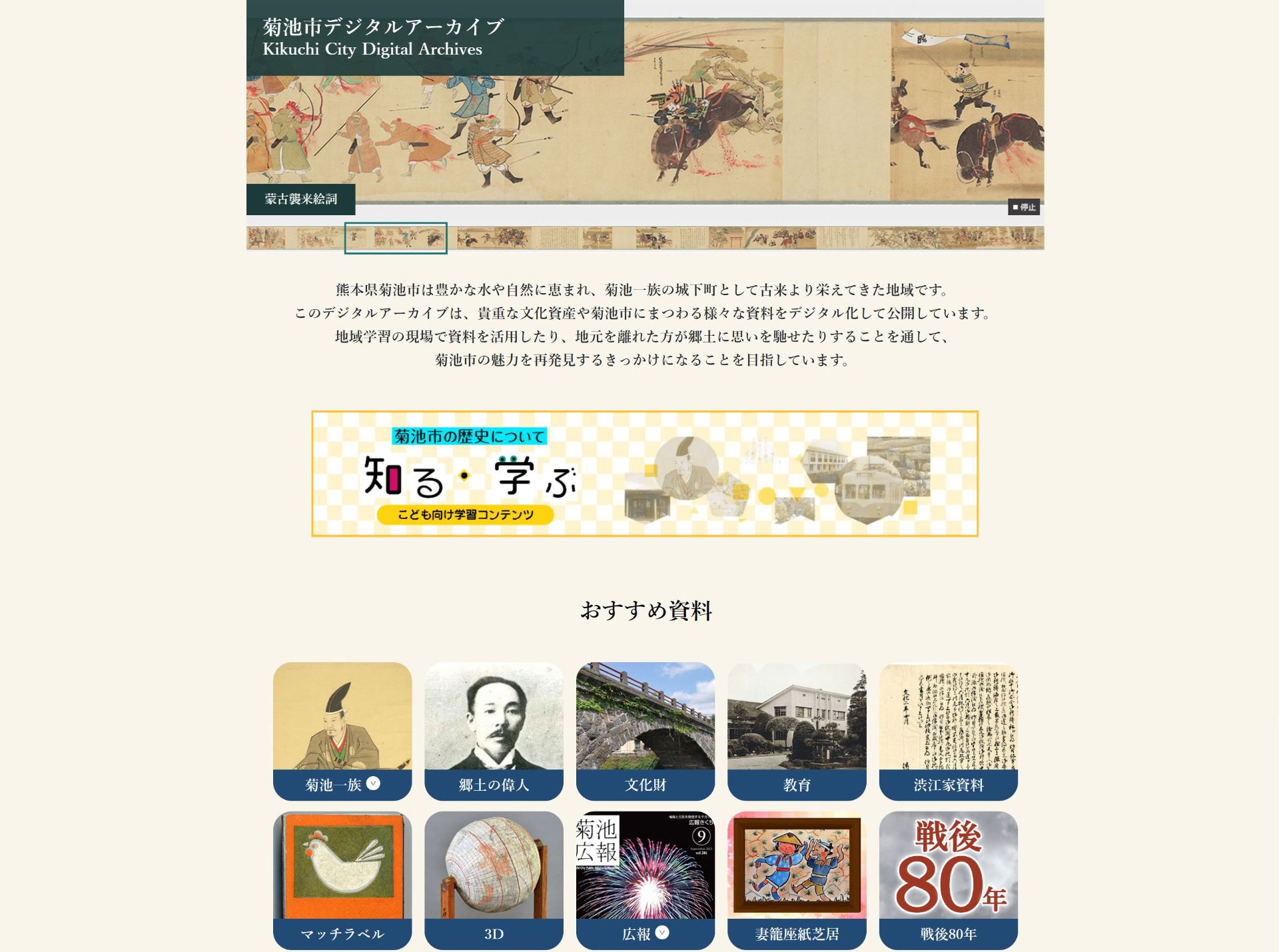 菊池市の貴重な文化資産やゆかりの人物に関する資料、教育関係資料、行政資料などを積極的に収集、保存、公開することで、地域学習の支援や郷土の魅力を再発見するきっかけを提供しています。教育現場での利活用を目的とした「こども向け学習コンテンツ」をはじめ、利用者のニーズに対応したきめ細やかな配慮がなされており、他のアーカイブ機関において参考になる部分が多い点を高く評価しました。