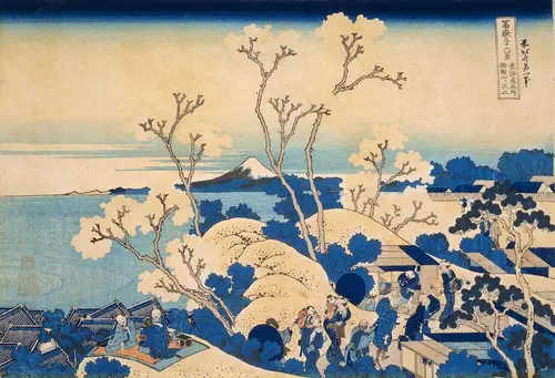 葛飾北斎は「冨嶽三十六景」において、富士山というひとつの対象を、様々な場所、季節、気候条件で連作することによって、富士の様々な諸相を自由自在に描き出した。さらに北斎はここで舶来の化学染料、通称ベロ藍と呼ばれる、それまでの植物性の藍には無い鮮烈な青色を多用することによって、当時の人々の感性に直接訴えかける鮮烈なインパクトを放ったのである。こうして様々に新しい手法を取り入れた風景表現の斬新さが、人々の異国趣味を刺激して大いに成功し、これ以降、名所絵が浮世絵のジャンルとして確立したのである。