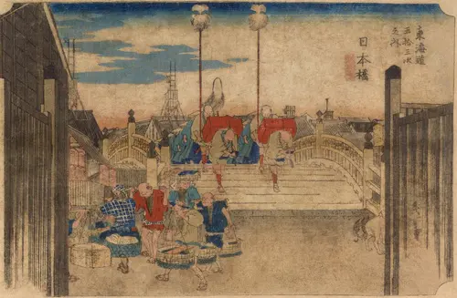現在の東京都中央区にあたる。東海道の起点・日本橋の朝の景色。朝焼けを背に大名行列が橋を渡り始める様子が窺える。先箱持ちを先頭に毛槍と続き、陣笠の従士たちが整然と列をなしている。手前には魚河岸から帰った魚屋や野菜売り、犬の姿を見ることができる。左右に開いた大木戸の間から覗くような視点が面白く、大木戸の縦格子と毛槍の縦のラインと橋の板目の横のラインが画面に一定のリズムを与え、堅固な構図を作り上げている。