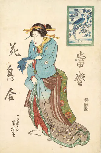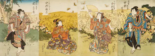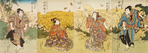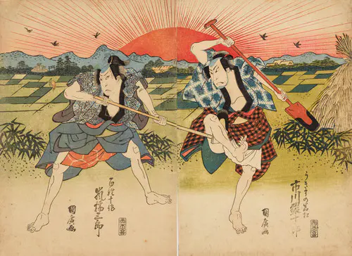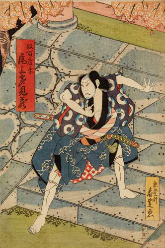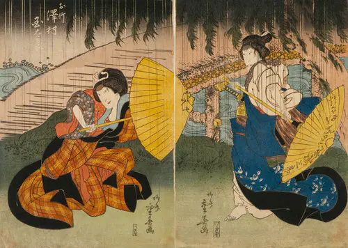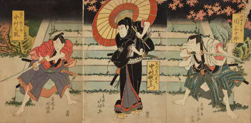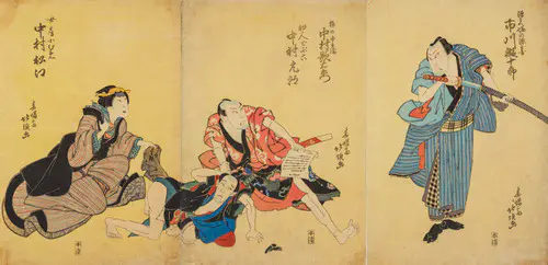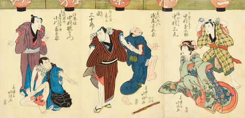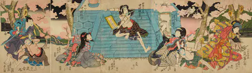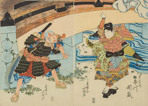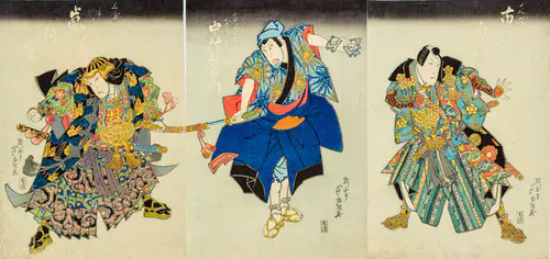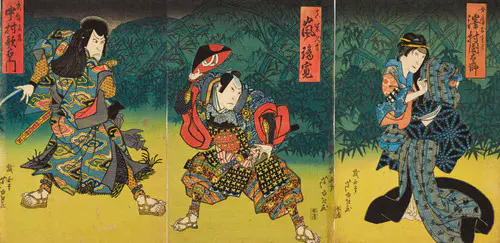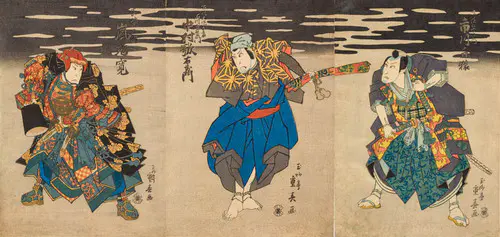 なかでも、三枚続きの錦絵には名品が多く、まるで映画のワンシーンのような劇的な画面構成は見るものを圧倒する。兄弟子の国貞(三代豊国)とともに幕末の浮世絵界を牽引し、彼の門下生は70数名に及んだといわれる。