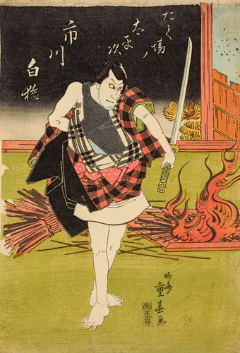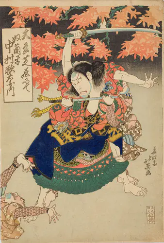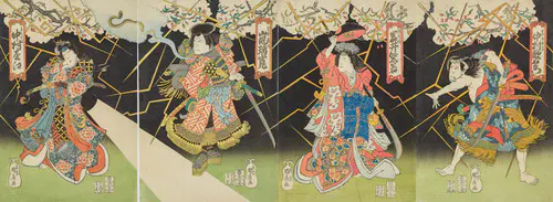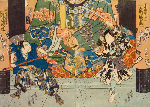 源義経を描いた「義経千本桜」のうち「川連館」の場面。静御前とともに義経の後を追っていた佐藤忠信。じつは狐が化けた偽物であった。この忠信狐、義経が天皇から賜り、静御前に預けていた「初音の鼓」を慕い、付き従っていたのである。じつはこの鼓は千年の年を経た雌雄の狐の皮を張ったものであり、その狐こそ忠信狐の両親であった。義経がかくまわれていた川連法眼の館を舞台に、佐藤忠信を詮議する義経と静御前。ついに素性をあかす狐。狐が親を思う子の情に感じた義経が、源九郎という自分の名とともに鼓を与えるという伝奇的なドラマが繰り広げられる。本図には、静御前に斬りつけられて姿を現した狐が描かれる。
