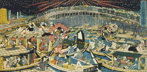両国橋は、江戸の下町を流れる隅田川にかかり、当時橋をはさんで見世物小屋など各種の店が連なり、江戸最大の賑わいをみせる場所であった。画面は夏の花火の光景で、橋の上は無数の見物人であふれ、川面は数え切れないほどの屋形舟でごったがえし、舟上では花火に浮かれる男女が思い思いの姿で夏の夜を楽しんでいる。大きくアーチを描く橋を中景として両岸の家並みがやや極端な遠近法で処理され、あの下にはさらに下流の橋が小さく描かれていて、雄大で臨場感に富んだ一大パノラマとなっている。