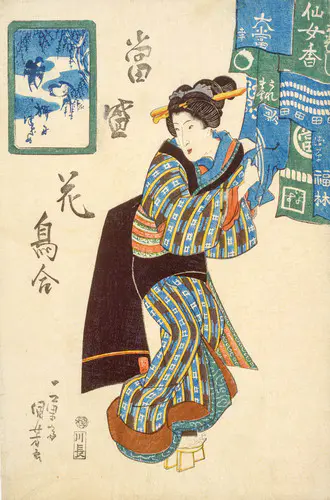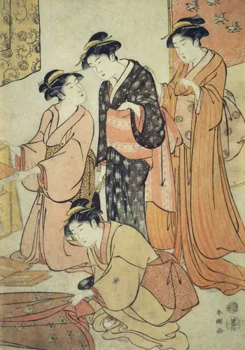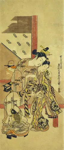 「浮世絵」という言葉が登場するのは天和年間(1681-84)頃で、版本挿絵を手がけていた菱川師宣が、挿絵を独立した版画として手がけたのが浮世絵の始まりとされる。当初は墨一色やそれに筆で彩色したものであったが、明和2年(1765)に鈴木春信が数色の色版を摺り重ねる技法を完成させた。錦の織物のように美しいこの多色摺の版画は「吾妻錦絵」と呼ばれ、江戸市中で大評判となった。