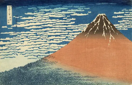 冨嶽三十六景シリーズを代表する作品。画題にある「凱風」とは南風のこと。「赤富士」とも称されるこの情景は、夏から秋にかけての早朝にかぎり見られるという。諸説はあるが、右側に寄せられた構図は左側(東)からの光を意識しているとも感じられ、河口湖付近から富士の北側を捉えたと思われる。秋を予感させる鰯雲の中に悠然とそびえるその偉容は、富士を形象化した作品の中でも唯一無二の逸品といえよう。