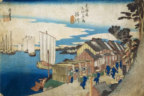 現在の東京都品川区にあたる。東海道の最初の宿場町となるのがここ品川である。本図では大名行列のしんがりの姿が描かれている。「日之出」という画題からして、明け方近くの情景であろう。街道脇の店のほとんどは閉まっているが、手前の茶屋だけは店を開け、中には客らしき女の姿も見える。品川は吉原につぐ遊里としても栄えていたという。右側の切り立つ山が八ッ山、左に開ける海が品川湾だが、今日ではいずれも見ることはできない。