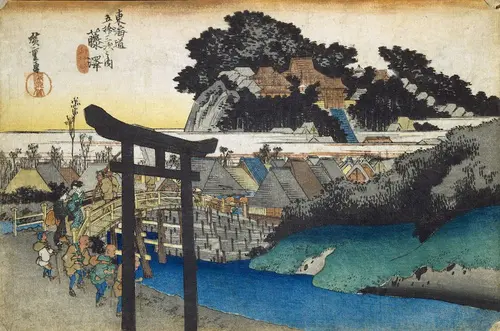 現在の神奈川県藤沢市にあたる。手前を流れる川は境川、架かる橋は遊行寺橋と見られる。奥の山中にひっそりと佇む遊行寺と、その門前町として栄えた藤沢宿の様子が描かれる。眼前に鳥居を置いた構図は斬新で、広重特有の感性を垣間みることができる。この鳥居は江の島弁財天のもので、江の島を目指す4人の座頭が今まさに通り抜けようとしている。広重はこの鳥居をよほど気に入ったのか、別のシリーズでも違う角度から描いている。
