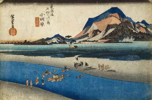 現在の神奈川県小田原市にあたる。遠景の様々な色彩と形で構成された山の表現が斬新に映る。山のふもとには小さく小田原城とその城下の町並みが描かれている。手前を横切る酒匂川は幕府の政策により架橋や渡船が禁止され、川越し人足による徒渡しによって渡る方法しかなかった。ここではふんどし姿となった人足の肩車を使って渡る者や、複数の人足が担ぐ輦台(川を渡すための台)で渡る者など、様々な徒渡しの様子が描かれている。