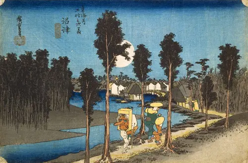 現在の静岡県沼津市にあたる。街道沿いを流れる狩野川に沿って橋を渡った向こうは沼津宿である。本図で注目すべきは中央の男が背負う大きな天狗の面であろう。この男は讃岐の金毘羅参りへの途上で、天狗の面は金毘羅大権現への奉納品とみられる。その前を行く2人連れは比丘尼とその従者。手には布施を受けるための柄杓を持っている。夕闇が迫る黄昏の時間帯。宿場へと急ぐ人々を、皓々と照った月の光がやさしく包み込んでいる。