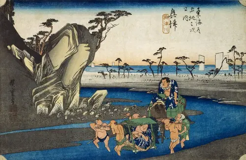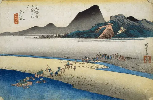 「箱根八里は馬でも越すが越すに越されぬ大井川」と詠われた東海道最大の難所である大井川。金谷は現在の静岡県島田市に位置する。江戸時代、架橋、渡船が禁じられていた大井川では川越しの人足や馬の背に荷駄や人を乗せる徒渡しが行われていた。まるで、海のように波打つ川を、金谷宿と島田宿の双方から徒渡しで往きかう旅人や荷駄が描かれている。向こう岸には堤防が波のうねりと呼応するような形で描かれている。