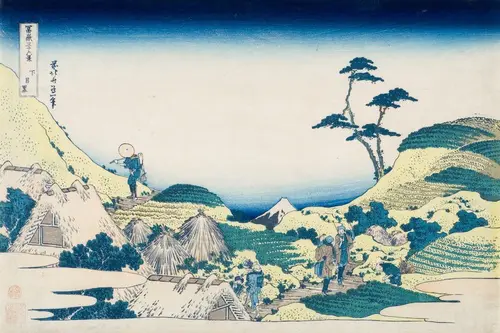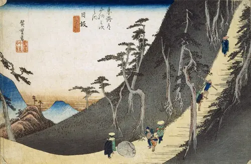 現在の神奈川県足柄下郡箱根町にあたる。主役の富士を凌駕するように極端に競り立った山が画面中央に描かれ、対照的に白く雪化粧した富士が遠景にひっそり佇んでいる。山間を抜ける細く急勾配な坂道を下る大名行列の姿は「天下の嶮、千尋の谷」と謳われた箱根の峠越えの厳しさを物語っているかのよう。モザイク画を思わせる多彩な山の岩肌の表現と連なる大名行列の動きが画面にリズムをもたらし、観る者の好奇心を満たしてくれる。