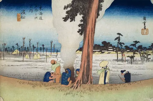 現在の静岡県浜松市中区にあたる。街道脇の大きな杉の木の根元で、焚火をしながら暖をとる旅人たち。焚火から立ちのぼる煙が黒から白へ変化している様子も良く捉えている。刈入れの終わった田んぼに立て札の立つ松林があるが、これは「颯々松」と呼ばれた旧跡で、その昔、将軍足利義教が松の下で酒宴を催した際に「浜松の音はざざんざ」と謡ったことで有名になったという。右奥に見えるのが浜松の宿場で浜松城の天守閣も見える。
