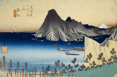 現在の静岡県湖西市にあたる。舞坂の渡し船「今切の渡し」を描いたもの。先を行く幔幕が張られた船は大名行列の一行を乗せた御座船である。時刻は夕刻頃と見られ、西の空が暮れようとしている。後続の舟には中間と呼ばれるお供たちが欠伸をしたり、身体を丸めて寝入る姿が見える。舟が向かう先に見えるのは新居の関所。この関所は幕府の直轄下にあり、取り調べが特に厳しいことで知られ、船着き場はこの関所の中に置かれていた。