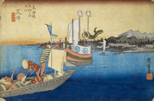 現在の神奈川県川崎市川崎区にあたる。東海道五拾三次の道のりの最初に渡る大きな川が本図で描かれる多摩川である。対岸に見えるのが川崎宿。多摩川は六郷川とも呼ばれ、ここを渡す船は「六郷の渡し」といわれた。もともとは大きな橋が架けられていたが、たびたび洪水で流されたため、舟で渡河するようになったという。画面奥には西日で真っ赤に染まった空と雪化粧した富士の姿のコントラストが美しく、情感をかき立てられる。