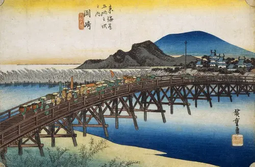 現在の愛知県岡崎市にあたる。眼前を流れる矢矧川に架けられた矢作橋は、幕府によって架けられた東海道随一の大橋であった。東海道の名所をまとめた書籍である『東海道名所図会』には「長さ二百八間(約370メートル)…東海第一の長橋なり」とある。広重はこの大橋に大名行列の一行をずらりと並ばせることで、その長さをより一層強調したかったのであろう。対岸に姿を見せているのが、徳川家康が生誕したとされる岡崎城の天守閣である。