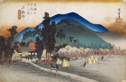 現在の三重県鈴鹿市にあたる。遠景に大きく描かれた山々。そのなだらかな山容と色彩が美しい。山のふもとに見えるのが石薬師寺である。田んぼの畔道を突き当たると寺の立派な山門があり、その右手に宿場が広がっている。田んぼではすでに稲刈りが終わっており、周囲の木々が色づいていることからして、季節は晩秋から初冬あたりと思われる。時間帯は夕暮れであろうか、山里にはひと仕事終えたようなのんびりとした時間が流れている。