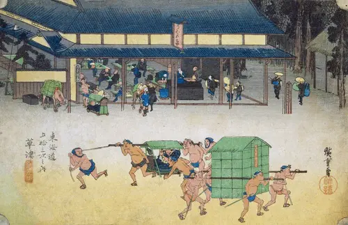 現在の滋賀県草津市にあたる。草津は東海道と中山道の分岐点にあたり、交通の要所として賑わっていた。ここには名物の「姥が餅」を食べさせる「うばがもちや」があり、この茶屋は旅人の格好の休み処として古くから知られていた。茶屋の店内には、この餅をこねる人、運ぶ人、待つ人、食す人などさまざまな人間模様が描かれている。茶屋の前を横切る道がまさに東海道で、早駕籠と荷物担ぎが休む間もなく往来する様が窺える。