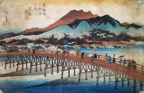 現在の京都市東山区にあたる。江戸の日本橋を起点に始まった《東海道五拾三次》も京の玄関口といわれた三条大橋が終着点である。鴨川に架かる三条大橋。川向こうには京都の町並みが広がり、その背後には東山三十六峰が見える。本図で三条大橋の橋桁は木組みで描かれるが、実際は石製の橋杭だったという。橋上は駕籠持ちや飛脚、茶筅売り、被衣姿の女性、見物客など多種多様な人々で賑わい、古来より栄えてきた京都の活気を思わせる。