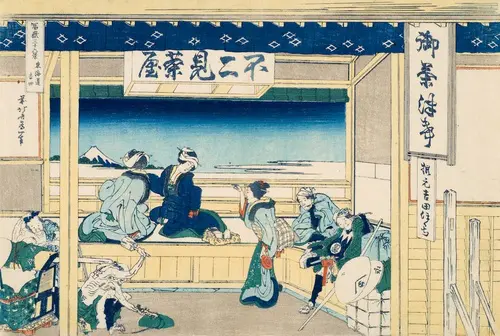 吉田は現在の愛知県豊橋市に位置する東海道の宿場。「不二見茶屋」はまさに富士が見える茶屋として有名であったのだろう。お座敷の一角を陣取った2人の女性客も見物を楽しんでいるようだ。軒下には「御茶津希(=おちゃつけ)」との看板が掲げられており、その下には「根元吉田ほくち」とこの地の名産であった火口(火打ち石の火を受けるもの)の掲示も見える。駕篭者の一人が草鞋を履きやすくするために木槌でたたく姿も興味深い。