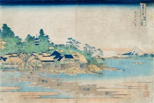 神奈川県藤沢市に位置する江の島は当時も人気の観光名所であった。現在は橋が架かっているが、当時は本図のように干潮時に現れた砂州を歩いて江の島へ渡っていた。限られた時間の中で江の島の弁財天詣でに急ぐ人々の動きが伝わってくる。また渡った先には大きな石灯籠が見え、そこが参道の入口であることが分かる。参道脇にはすでに店が軒を連ねており、ここに多くの人が訪れていたことを窺わせる。砂州の両側に寄せる波の点描表現も面白い。