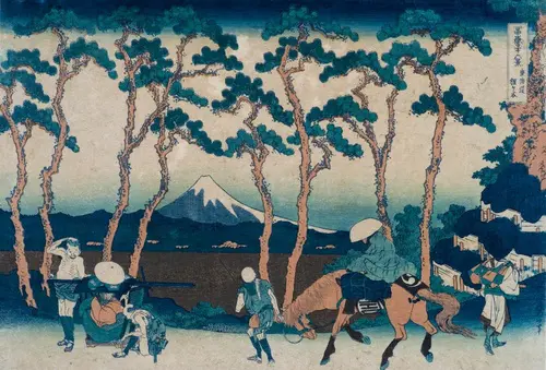 程ヶ谷は現在の神奈川県横浜市保土ヶ谷区。程ヶ谷宿近くの品濃坂は松並木が見事であったという。北斎はその松の枝振りを見事にとらえて描いている。また松の前ではさまざまな人間模様も描かれて、左側の駕篭を担ぎ、一旦休憩する二人の男とその中で熟睡する客。汗を拭く左側の男のしぐさは何ともコミカルで憎めない表情を浮かべている。また右側の草鞋の紐を結び直す男の描写も巧みで北斎の技量を感じさせる。