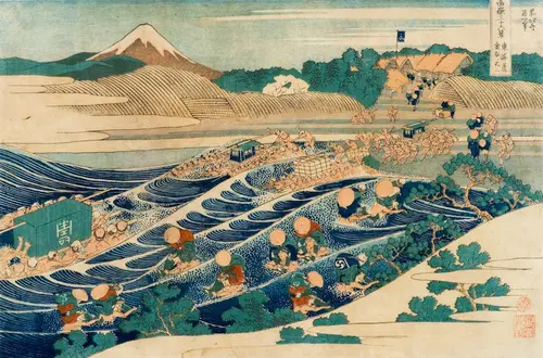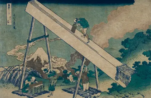 遠江は現在の静岡県西部に位置する。巨大な材木を人の高さの倍以上もの高さにまで立て、2人木梚き職人が大きな歯の特別なのこぎり使い、1人は材木によじ登り、上から丹念に切れ目を入れ、1人は下から切れ目を入れている。富士は材木を支える支柱が作った三角形の間から顔を覗かせている。職人たちが働く傍らでは、子どもが焚火をしており、その煙は富士を取り巻く雲と連動するように、バランスよく材木と対角線の方向に伸びている。