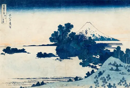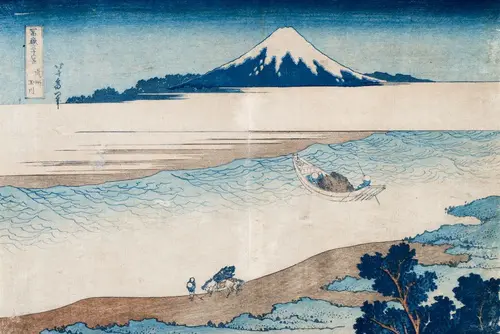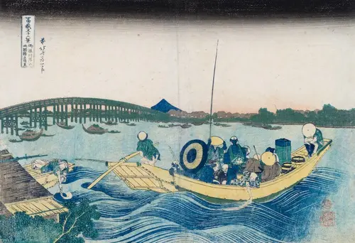 御厩川岸は隅田川の両国橋と吾妻橋の中間、現在の厩橋が架かる付近。本図は富士の位置からして厩橋の北側からのアングルを捉えており、まさに今、渡し船が対岸の浅草方面に向け離岸した刹那を描いている。船は帰路を急ぐ客で溢れ返り、一日の疲れからかうずくまる客もいれば、汗を拭こうとしているのか、水面に手拭いを濡らしている客もいる。船を漕ぐ船頭の視線の先には、夕日に浮かんだ富士の美しいシルエットを臨むことができる。