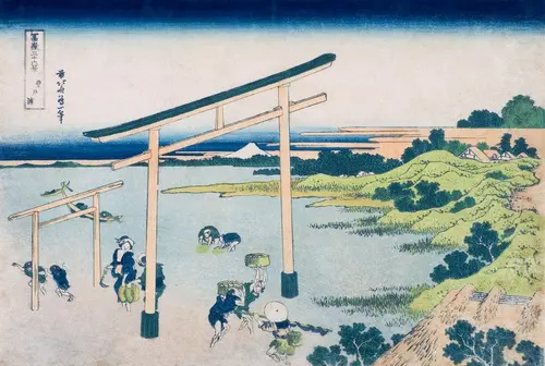 登戸浦は現在の千葉県千葉市中央区に位置する。地名は「のぼと」又は「のぶと」と呼ばれ、浅瀬に立った鳥居は登渡神社のものとされる。鳥居の周辺には潮干狩りを楽しむ人々が描かれ、画面左側にははしゃぎ回る子どもたちの姿も見える。中央に大きく描かれた鳥居の中に富士が描かれるが、鳥居の大きさや角度、海面と陸地の配分など、全て計算されたかのような構図は極めて精巧といえる。