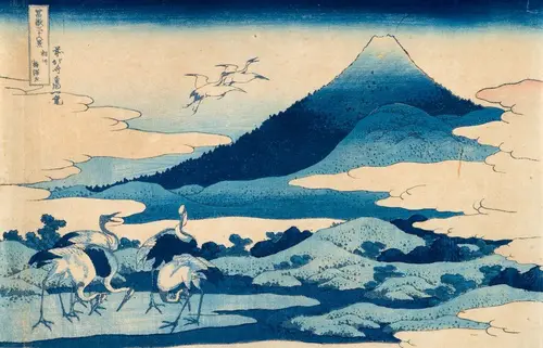 梅沢は現在の神奈川県中郡二宮町に位置する。「梅沢左」とあるが「梅沢庄」か「梅沢在」の誤刻だと考えられる。梅沢は大磯と小田原の間にあった立場(休憩所)として賑わっていた。左右に配置された雲、水辺に寄り添う5羽の鶴、そして富士に向かって悠然と飛ぶ2羽の鶴は、蓬莱山図など縁起のよい吉祥図を想起させる。本図は発色がよく、当時人気のあった顔料であるベロリン藍(通称ベロ藍)を基調に仕上げた藍摺りと呼ばれる作品。