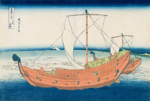 上総は現在の千葉県中南部一帯を指す。この一帯は江戸時代、海運で大いに賑わっていたようだ。本図は、浦賀水道付近からの眺めと推測される。同型の2隻の船が精巧な描写で描かれているが、よく見ると側面に開いた窓からは乗客であろうか、3人の男たちが顔を覗かせているのが分かる。その男たちの顔の縮尺からすると、この船は10m近くあるとみられるが、実際は定かではない。富士は大きく弧を描いた帆の彼方に小さく配されている。