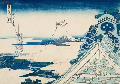 浅草本願寺は現在の台東区浅草に位置する。もともと神田明神下にあったが、明暦3年(1657)の明暦の大火の後、浅草へ移転した。大屋根をもつこの壮大な建築は江戸の市民を驚愕させたという。屋根の職人たちは幾分小さく描かれており、屋根の大きさが強調されている。屋根と同じ高さから町を見下ろすアングルが斬新である。また屋根と富士山との対比も面白い。藍摺りを基調にしながら朱色の凧がアクセントとなっている。