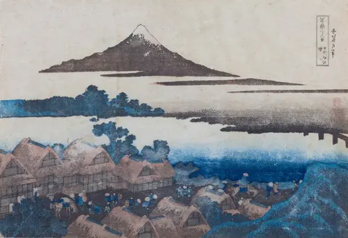 千住は現在の足立区。かつては奥州街道の起点で、水戸街道、日光街道へも続く交通の要衝であり、江戸四宿のひとつとして有名であった。ここでは宿場の風景は描かず、ややはなれた隅田川上流の荒川水門脇のあたりを描いている。リズミカルな水門の柱の間にあえて富士を配置し、構図に一工夫加えている。頭を下げ、山なりになった馬の体躯と富士の姿を相似させている点も面白い。