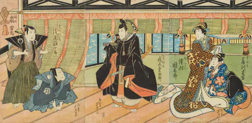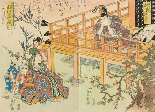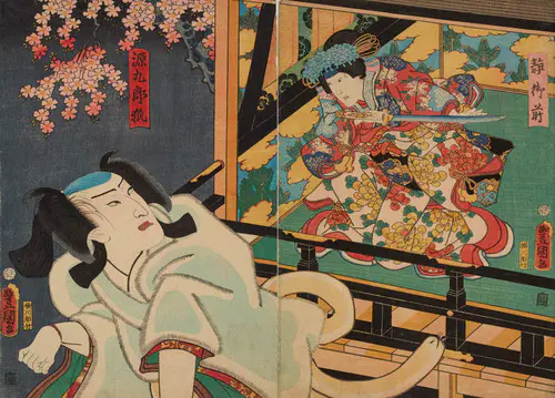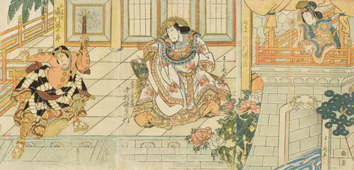 「伊達家の三代藩主・伊達綱宗が吉原の高尾太夫に魂を奪われ、廓での遊蕩にふけって隠居させられた。これはお家乗っ取りをたくらむ家老原田甲斐と黒幕である伊達兵部ら一味の仕掛けによるものであった」。江戸時代前期に伊達氏の仙台藩で起こったお家騒動、いわゆる「伊達騒動」について、巷ではこのような物語がつくられ、歌舞伎でもそのような筋書きでたびたび上演された。ただし同時代の事件などは題材とすることが禁止されていたため、ここでは鎌倉時代の物語とされている。本図は、吉原に入り浸っていた足利頼兼(伊達綱宗)が、恋する高尾太夫が自分を裏切ったのではないかとの疑いを抱いて問いただしている場面である。