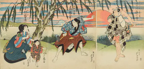 現在の品川区に位置する御殿山には、江戸時代に桜の木が植樹され、海と桜を一度に楽しめる名所として賑わっていたようだ。富士は計算されたかのように、2本の桜の合間から顔を見せている。本図の画面手前には、御殿山の丘陵にゴザを引いて酒を興じる男衆や、家族連れであろうか、稚児を肩車する男性に同じく稚児をおんぶする女性、はたまた扇を手におどける男たちなど、思い思いに花見を楽しむ人々の姿が生き生きと描かれている。