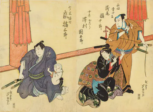 「伊賀越道中双六」のうち岡崎の場面。敵である澤井股五郎を追って藤川の宿までたどり着いた唐木政右衛門は、股五郎の許嫁お袖の父、山田幸兵衛の家を訪ねたところ、偶然にも幸兵衛はかつての武術の師匠であった。幸兵衛は政右衛門が股五郎の追っ手とは知らない。そこへ巡礼姿をした政右衛門の女房お谷が、大雪に見舞われて幸兵衛宅の門口を訪れる。政右衛門は自分が股五郎の追っ手と悟られるのを恐れて、お谷を追い返し、目に涙を浮かべて、お谷が抱いていたわが子の首をはねる。その涙にすべてを悟った幸兵衛は愛弟子政右衛門の苦衷を察し、股五郎の行方を教えてやる。
