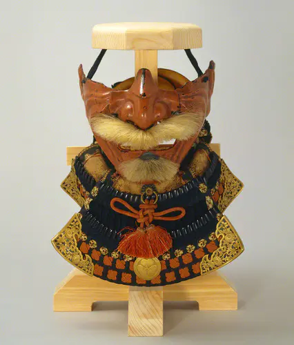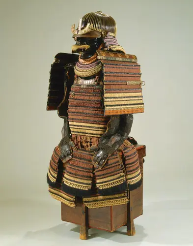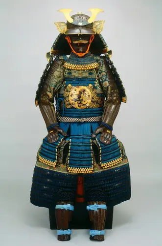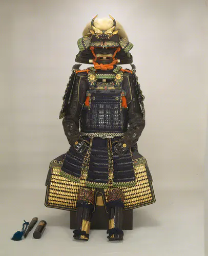 具足とは事物の完備、充足を示す言葉だが、武家の全盛期に至って完備した大鎧の形式をさすようになった。この具足は江戸時代後期の重厚な、そして堂々たる風格の逸品で、小栗上野之介の所用と伝えられる。甲冑の主要部分を構成する黒い小札と紺色の威絲が重量感を草摺と前立の金が豪華さを与え、細部にいたるまで精緻な技巧を凝らした作りが見事である。