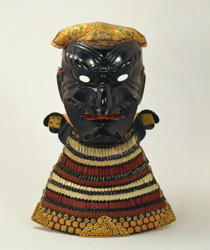 総面頬は顔全体を覆う防具で、南北朝時代頃から製作されているが頬当ほどは流行せず、江戸時代になって甲冑師たちが技術を誇るために作ったものがほとんどである。この作品もその一つで、面の全体を煉革地に黒漆塗りで仕上げ、垂は古代紫糸を本小札で五段に威した非常に手の込んだものである。また吹返には、“広大”“盛大”“強大”などを意味する[大文字]の文様が金で施されている。