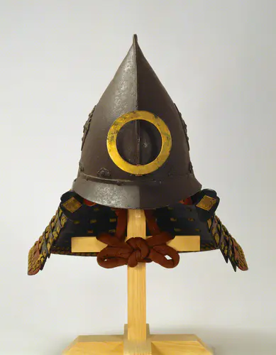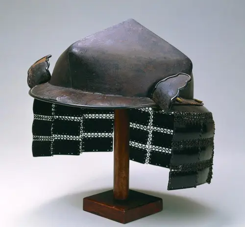 厚い煉革の前方を反らせ黒漆塗りで、前方正面の中に鳳凰を、下方に梅鉢紋をほどこし、左右に桐の模様を金蒔絵にして、後方正面の中心に三ツ割の梅鉢紋を置く。作域は、漆及び蒔絵ともにすぐれている。