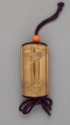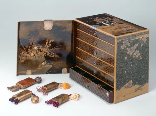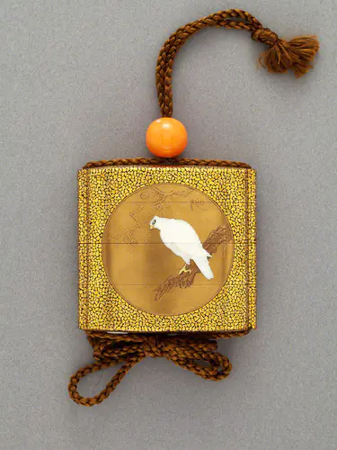 印籠というのは本来は印判や印肉を納める容器であるが、江戸時代には携帯用の薬入れとして用いられるようになった。4、5段重ねに仕切った偏平な小型容器で、紐が付いて腰に下げられるようになっている。印籠細工は江戸時代の工芸の最も特色ある一分野となった。印籠には在銘品も多く、本作品の作者芝山は青貝や象牙などの象嵌細工をよくした芝山仙蔵のことで、作品は芝山細工と称された。