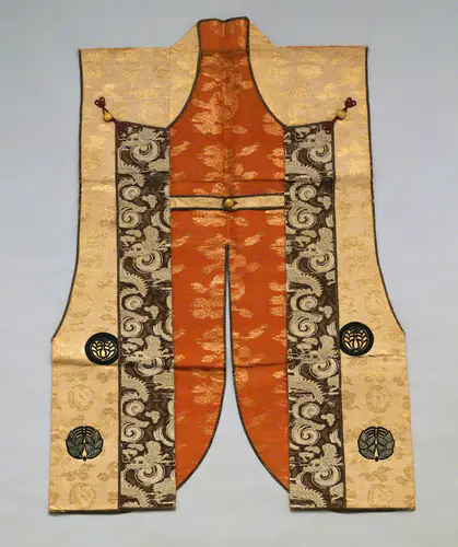 陣羽織は、近世以降に、武士が陣中やそれに準ずる場所で威容をととのえるために具足などの上に着用した。一般的には、袖なしで裾開き背割のものが多く、綴織やモール・羅紗・更紗、皮革・木綿・紙子など様々な素材が用いられ、材質や形状・色目や文様などに趣向を凝らしたものが多い。本作は、袖無裾開き背割の陣羽織の典型ともいえる形状で、生成色の地に金糸にて織り込まれた丸龍と鳳凰、瑞雲が華やかである。黒の羅紗地の切付で表された花杏葉の家紋は、生成色の地によく映えその存在を主張している。裏地は緋色の地で、金糸にて草花模様が織り込まれている。襟は濃い茶色の地に昇竜が表現され、陣羽織に相応しく勇ましさと武運長久の祈念が感じられる。花杏葉の家紋から鍋島家伝来の品と伝えられる。