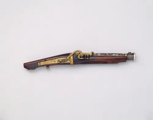 短筒は火縄銃の一種で、騎馬戦用の馬上筒(ばじょうづつ)から改良され、片手で持ったまま発射できることを特徴としている。戦乱の激しい戦国時代を経て、天下泰平となった江戸時代中期頃から上層の武士・町人等の間に、屋敷内の庭先を利用して標的を据え、殺傷能力の低い短筒で的当てを競い合う遊びが流行した。本作は、銃身に銀象嵌で青海波(せいがいは)文と登竜門の故事に因む鯉登滝図(りとうろうず)が施され、前目当(まえめあて)下方に三葉葵の紋様が彫り刻まれている。図様から徳川家の男子が、出世をした記念に製作されたもので、江戸時代中期の享保頃(1730年頃)のものと思われる。