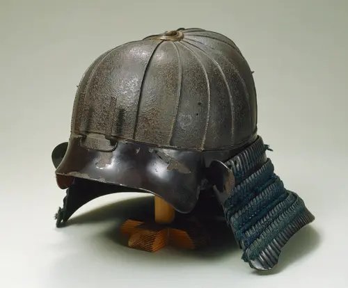 本作は、六十二間の筋兜の代表的なものの一つ。兜鉢の周囲に取り付けられた錣は、金漆塗りの地に古代紫糸を切付小札で五段に威しており、装飾物の脇立には、木彫に金箔を押した鹿角型のものを置いている。吹返の「六文銭」から、信州(現在の長野)の松代城主真田家伝来の兜と知ることができる。