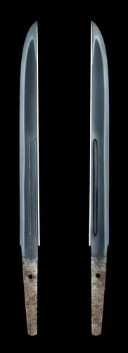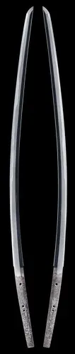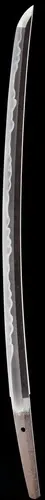 大太刀とは「長大な太刀」を意味し、現代の分類では一般的に刃長の長さが約三尺(約90センチ)以上のものを指します。南北朝時代には武士の豪放な気風を反映し実戦で用いられましたが、長大で重く扱いにくいという難点から、三尺を超えるような大太刀はやがて神社等へ奉納されるものも増えてゆきます。また多くは江戸時代に定寸とよばれる二尺三寸(約70センチ)前後に磨り上げられ(短くすること)、現存する四尺を超える大太刀は稀少です。