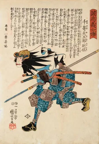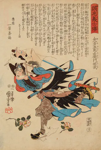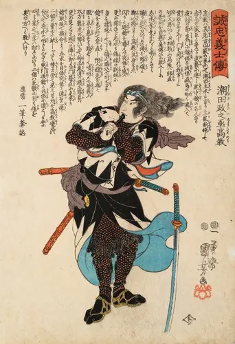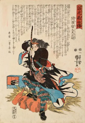 ここに描かれているのは、楠木正成の息子正行が壮絶な討ち死を遂げた四條畷の戦いである。四條畷は現在の大阪府四條畷市にあたる。正行は父正成の死後、南朝方として北朝の足利尊氏を討つべく準備をしていた。父譲りの戦略でいくつかの戦では勝利を得たものの、勢力の差はいかんともしがたかった。四條畷において、決死の覚悟で敵陣に突っ込み、無数の弓矢を射かけられるなか敵の大将高師直まであと一歩とせまるが取り逃がし、最後は自刃して果てたと言い伝える。この模様は「太平記」に詳しく書かれ、忠孝の父子として江戸の庶民に広く読み継がれていた。
