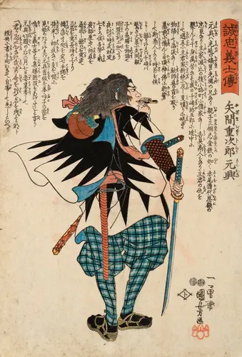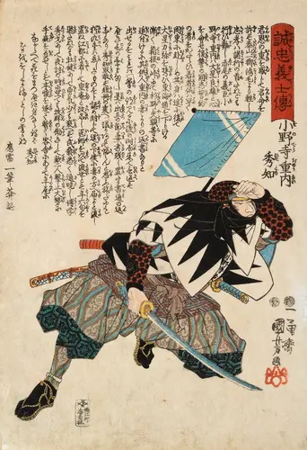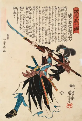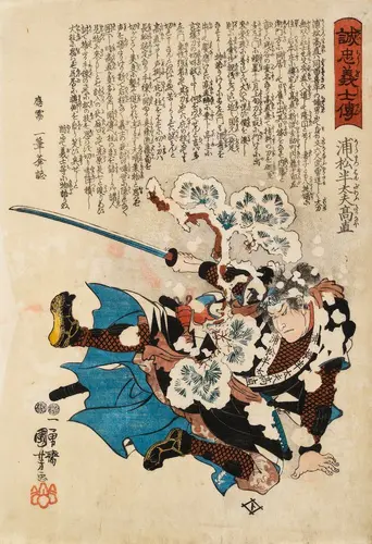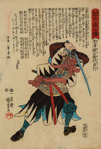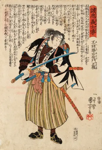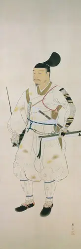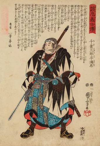 楠木正成は、鎌倉時代末期から南北朝時代にかけて活躍した武将。後醍醐天皇とともに鎌倉幕府を倒し、建武の新政の立役者となった。その後足利尊氏の挙兵に対し、勝ち目の無い戦ながら、最後まで天皇に付き従い、湊川の戦いで討ち死にした。足利尊氏も正成の死を「誠に賢才武略の勇士とはこの様な者を申すべきと敵も味方も惜しまぬ人ぞなかりける」と惜しんだという。その後この時代を書いた物語「太平記」が大流行すると、楠木正成の忠孝と軍略が後世の手本とされた。江戸時代に起こった赤穂浪士の討ち入りを題材にした「仮名手本忠臣蔵」の大星由良助(大石内蔵助)は、まさに楠木正成の生まれ変わりのような存在として庶民の人気を博したという。「大楠公の歌」は楠木正成と息子正行の桜井の駅での別れを題材としている。