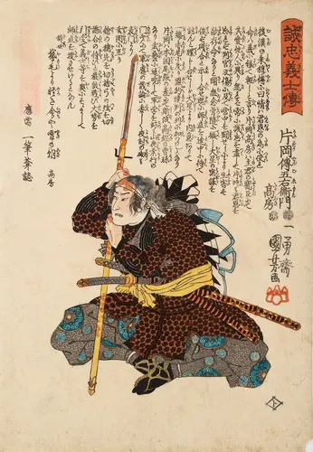 川中島の合戦は、甲斐の武田信玄と越後の上杉謙信が信濃の川中島を挟み数度に渡って繰り広げられた戦い。合戦の様子は江戸時代初期に成立した甲州流軍学書『甲陽軍鑑』に描かれている。山本勘助は武田二十四将の一人で、軍略と築城に長けた武将とされる。川中島の合戦では、兵を分けて上杉軍を奇襲する作戦を進言するも、敵に見破られ、武田軍は窮地に陥る。この危機に際して、死を決した勘助は敵軍に突撃して獅子奮迅の働きをし、最後は打ち取られたとされる。