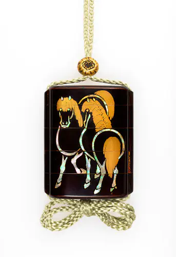 昔形4段の印籠で、黒蝋色塗地に螺鈿と平蒔絵で骨描きの野馬を表す。段内部は金梨子地。表紐通部に作銘。フランスでジャポニスムを広めた中心人物として知られる美術史家ルイ・ゴンスの旧蔵。類例が数点知られる。