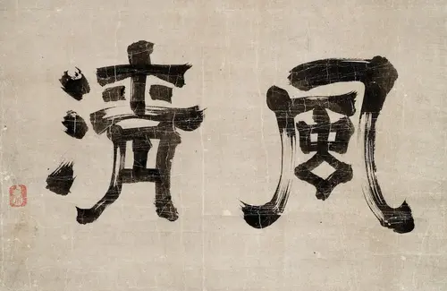 小堀遠州は桃山時代から江戸時代前期にかけての茶人。遠州流の祖。早くから古田織部(1543-1615) に茶の湯を学んだ。徳川三代将軍家光(1604-51) に献茶し、これが将軍家茶道師範の称のおこりとなった。「きれいさび」の茶を主張し、また、建築、造園をも手がけた。本作は中央に大きく「風清」の二字を横書きに大書した作品。個性的な書風であり、茶人遠州の面目躍如たるものがある。左隅に「宗甫」(朱文瓢箪印)の印を押す。