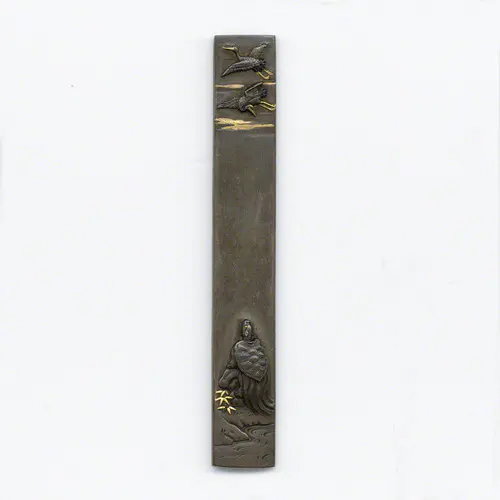 児島高徳は南北朝の武将。高徳は後醍醐天皇の倒幕計画に呼応し、備前(現在の岡山県)にて蜂起。後に天皇が隠岐配流となると、奪還を企てたが失敗。天皇一行が宿泊した夜、警備の目を盗み宿所の庭に入り、桜の木に「天勾践を空しうすることなかれ、時に范蠡なきにしもあらず」と刻み、天皇を激励したという。勾践と范蠡は中国・春秋時代の主君とその主君の危機を救った参謀のこと。本作ではまさに高徳がその言葉を刻み込まんと小刀を抜き出した刹那の場面が描かれる。歴史画で名士として知られた米僊の本地を窺い知れる佳品といえよう。